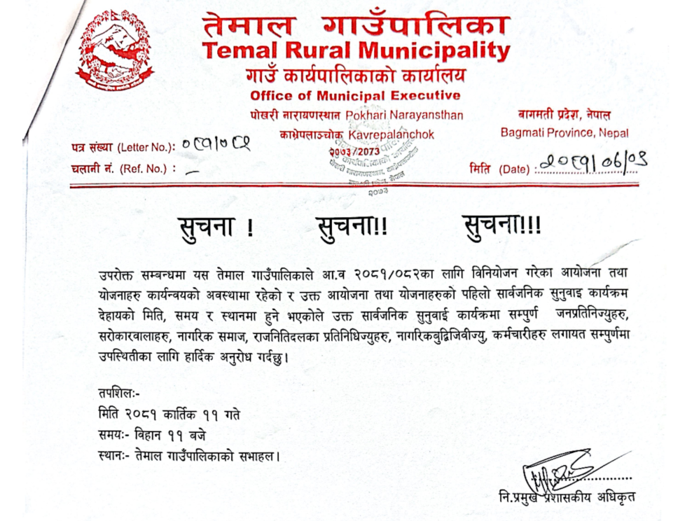 Home » तेमाल गाउँपालिकाको पहिलो त्रैमासिक सार्वजनिक सुनुवाई कार्यक्रम ।