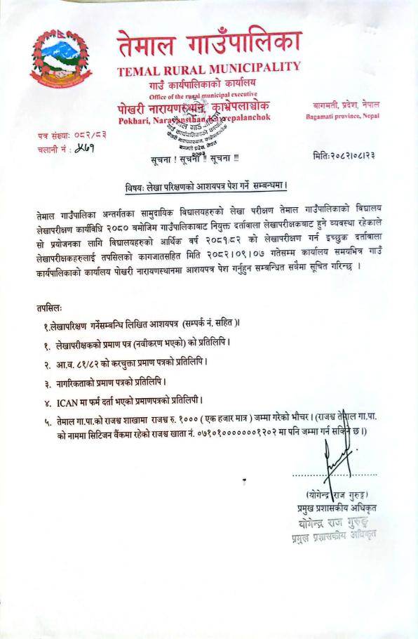 Home » लेखापरीक्षणको आशयपत्र पेश गर्ने सम्बन्धी सूचना ।